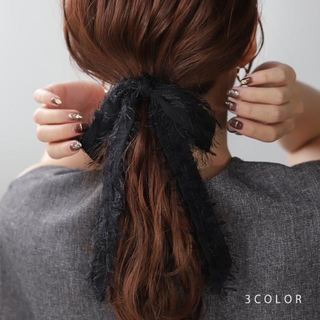 ボリューミーなシャギーフリンジのリボンポニーフック。上品で華やかなデザインだから、コーデのアクセントやオケージョンシーンにオススメ◎緩く流れるシルエットで大人っぽく着用できます。結び目に差し込むだけで、後ろ姿をこなれた雰囲気に導くアイテムです。
