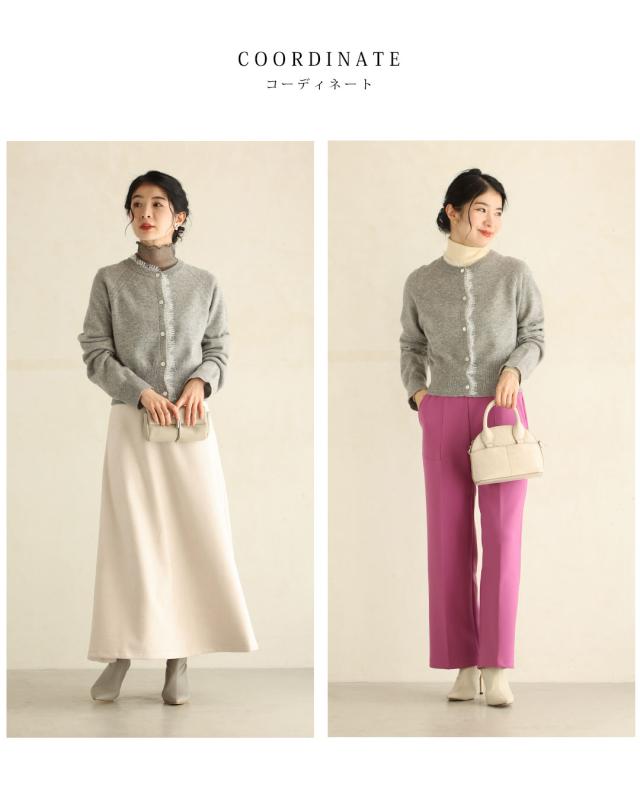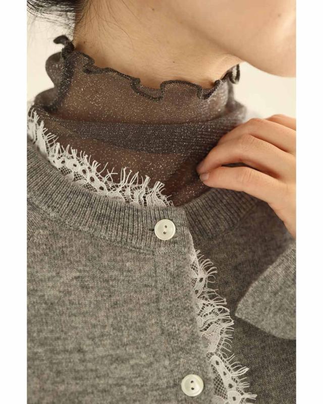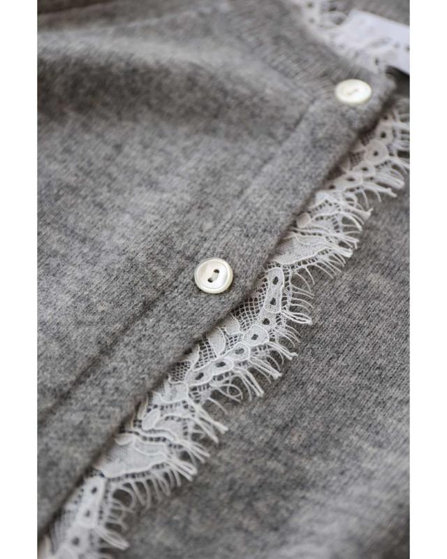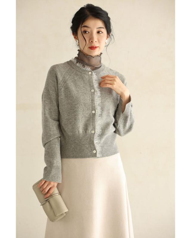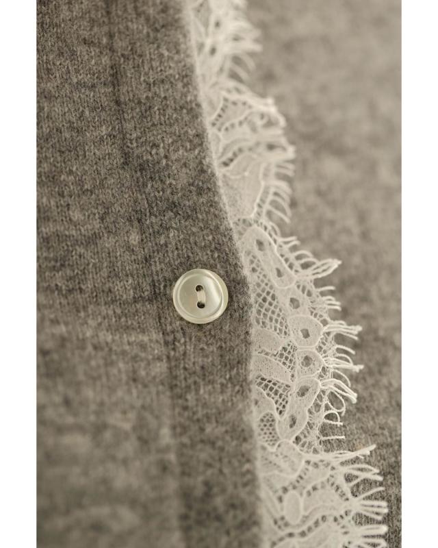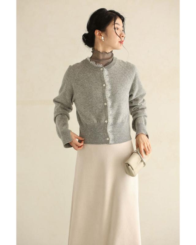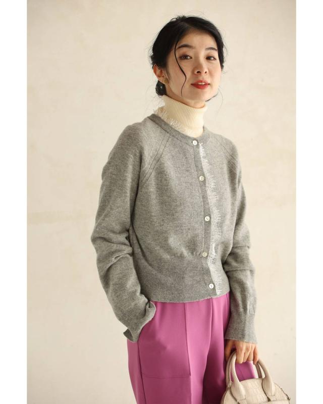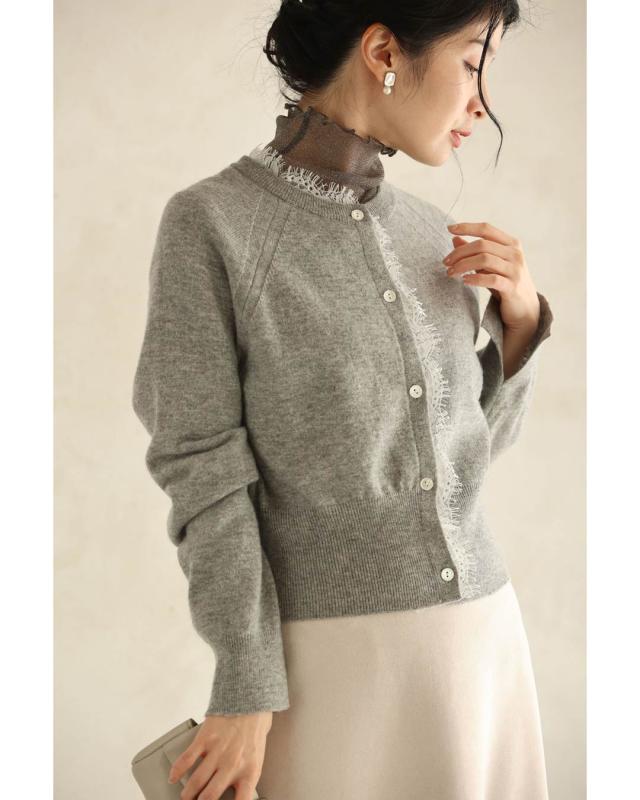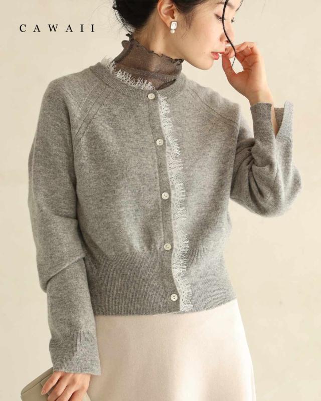 再入荷10月29日 首元から流れるアシンメトリーレースカーディガン cawaii w60966ps S~L対応 秋 冬 暖かい ぬくい 伸縮 グレー 日常使い 大人可愛い 短丈 スッキリ丈 ウール 羽織り ニット素材 レディース ファッション 大人 ママ ミセス 30代 40代 50代