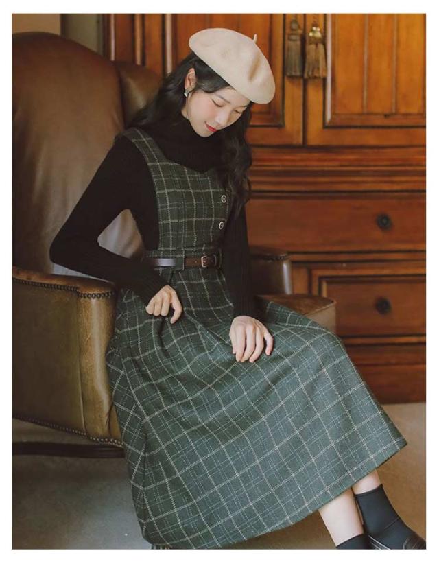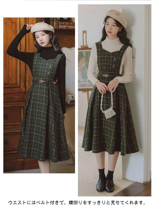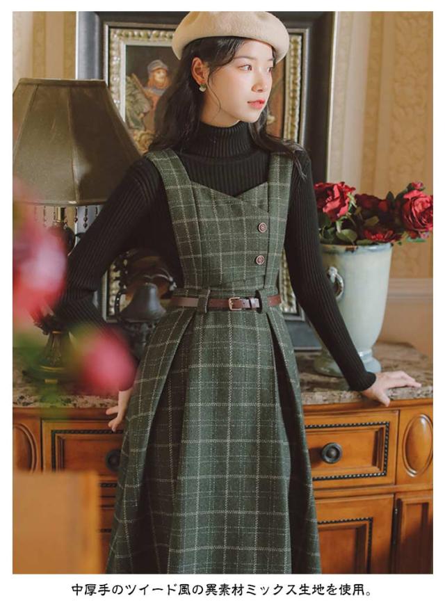 ツイード風 ロング ベルト付き 50代 スクエアネック ワンピース ツイード風 レディース 秋 冬 ロングワンピース 膝下丈 ノースリーブ ジャンスカ メルトン 厚手 Aライン 大人 きれいめ 通勤 オフィス レイヤード 重ね着 コーデ オールインワン