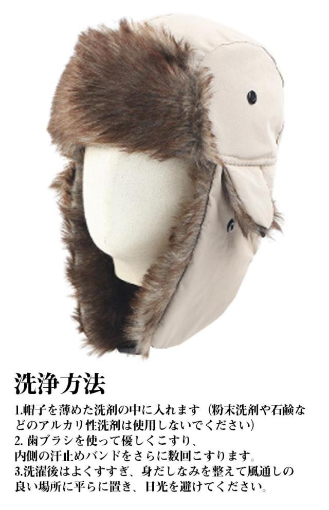 | ファーで丁度いいボリュームの耳当てと小ぶりのツバが可愛らしいデザイン。 ベースボールキャップよりファッション性が高く、 フライトキャップより気軽に被れる絶妙なバランス。 ワンランク上のキャップはいつものコーデにアクセントを加えてくれます。 アウトドアや、寒い日のお出かけにオススメしたいキャップです。 耳当て部分を垂らすととても暖かく、おしゃれ用だけではなく防寒にも最適です。 洗浄方法 1.帽子を薄めた洗剤の中に入れます(粉末洗剤や石鹸などのアルカリ性洗剤は使用しないでください) 2. 歯ブラシを使って優しくこすり、内側の汗止めバンドをさらに数回こすります。 3.洗濯後はよくすすぎ、身だしなみを整えて風通しの良い場所に平らに置き、日光を避けてください。 | |