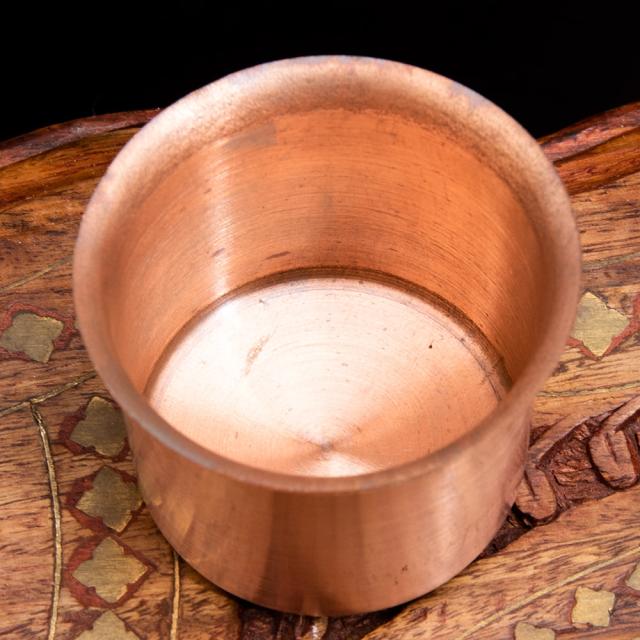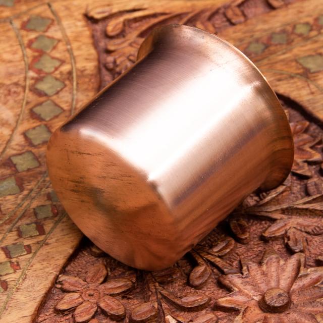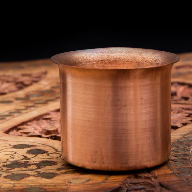 手のひらにすっと収まる、小ぶりな銅製カップは、インドのヒンドゥー教祭壇(プージャ)において、聖水やギー(澄ましバター)、米、花びら、香油などを捧げるために広く用いられてきた伝統的な道具のひとつです。その控えめながらも温かみのある輝きは、神聖な空間に穏やかな存在感を添え、祈りの時間をより静謐で深いものにしてくれます。インドでは古くから、銅は神聖な金属として重んじられ、浄化作用があると信じられてきました。特に水を銅の器に入れて飲む「タマラ・ジャル(銅水)」の習慣にも見られるように、銅は身体と精神の浄化を助ける素材として、日常生活と精神文化の双方で親しまれています。そのため、神々への供物を入れる器として銅製品が選ばれるのは、ごく自然なことでもあります。