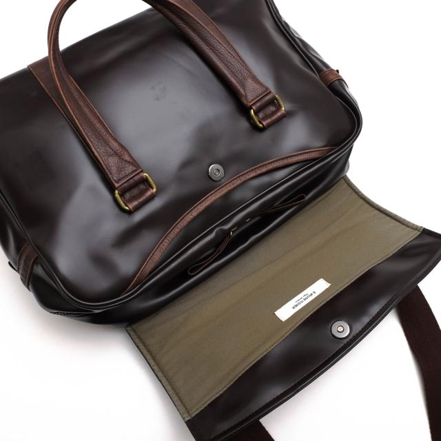 築地市場で働く人たちの集金バッグをモチーフに誕生した「Kashi(カシ)」シリーズのビジネスバッグ。メイン素材には軽量で扱いやすく、強度に優れた塩化ビニールを使用し、付属には上品なシボの入った牛革を採用しています。内装には可動式の仕切りや、サイドのドリンクホルダー、多機能ポケット、マグネット式ホックなど、機能美に優れた設計が施されています。内装には高密度コットンサテンを使用し、カラーコントラストにより収納物を見分けやすくしています。伝統的なデザインをスタイリッシュにアップデートしたユーティリティバッグです。