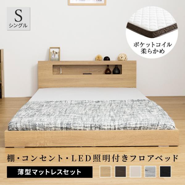 棚・コンセント付き フロアベッド ベッド LED照明付き シングル+薄型マットレス付き ロータイプ ローベッド ベット