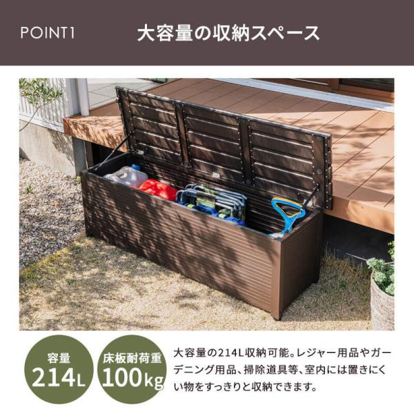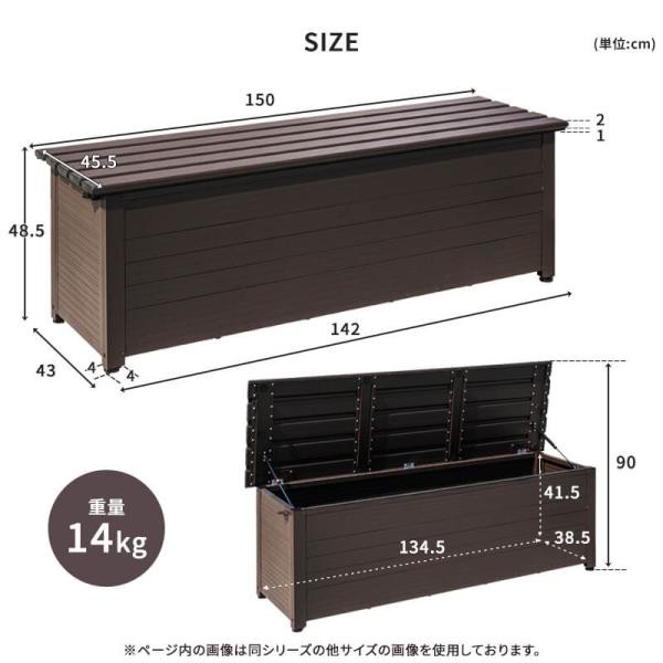 サイズ 本体外寸:幅150x 奥行45.5x高さ48.5cm 収納内寸:幅134.5x奥行38.5x高さ41.5cm 収納容量:214L ※収納容量は計算上の容量です。 商品重量 約14kg 梱包サイズ [1梱包] 幅48x奥行13x高さ153cm 仕様 本体:アルミ 塗装:亜鉛メッキ塗装 備考 お客様組立 完全防水ではございません。隙間から雨水が入る場合もございます。あらかじめご了承ください。 保証期間 商品お届け日から1年間 |