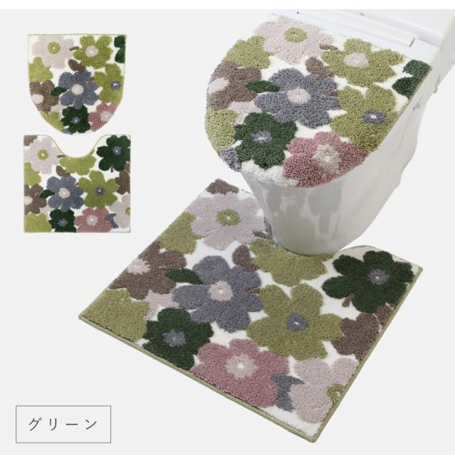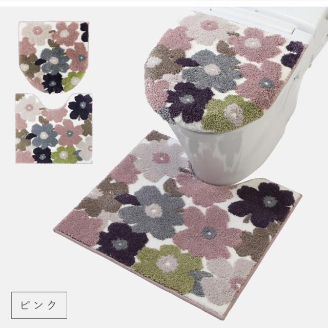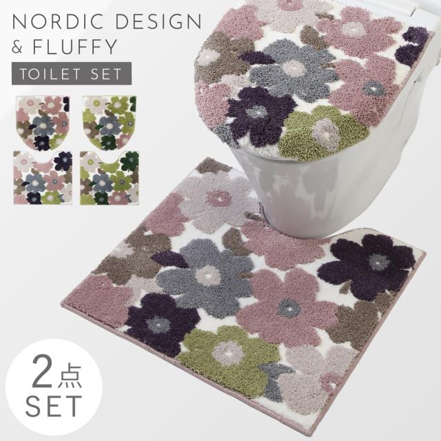 トイレマット 花柄 ふわふわ トイレ フタカバー セット ふかふか 洗える ピンク グリーン 北欧 おしゃれ フルール トイレ足元マット+フタカバー 2点セット