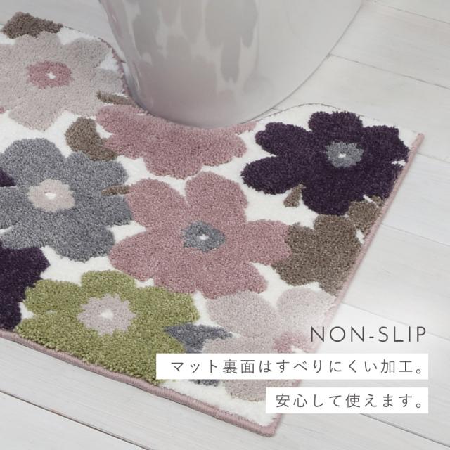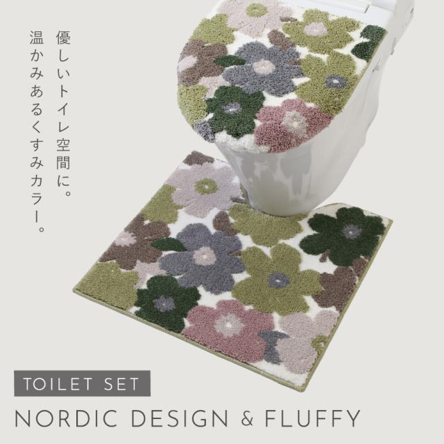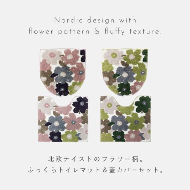 北欧テイストのフラワー柄。ふっくら柔らかな足元マット&兼用フタカバーセット。少しくすんだ北欧テイストのカラーと、温かみある優しいフラワー柄。トイレ空間が華やかに。