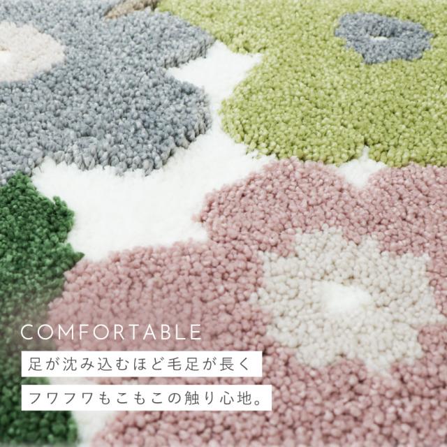ふっくらと柔らかな糸を高密度に敷き詰めふかふかの仕上がり。フラワー柄は毛足の長さに変化をつけ立体感のある仕上がりに。