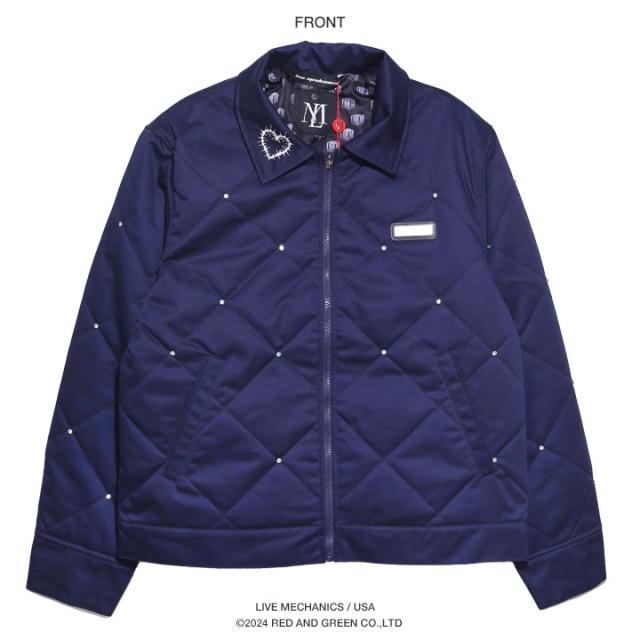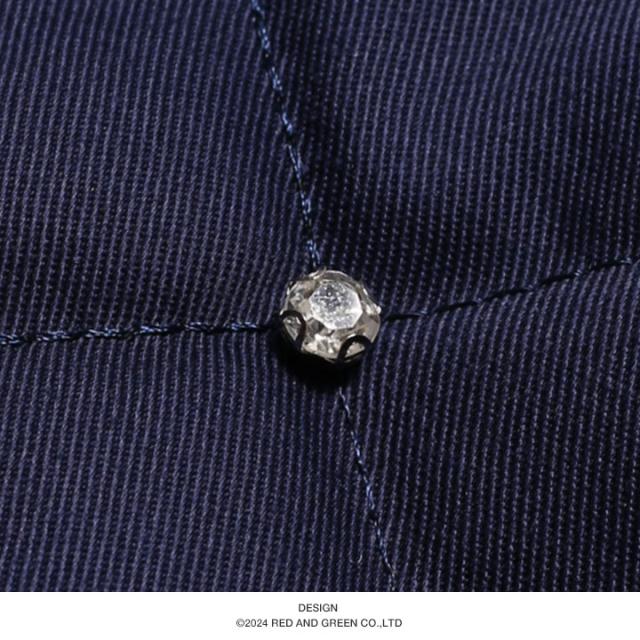 襟にパンクなハートモチーフ刺繍、ボディ全域に、アーガイル状のキルティングと共に、ダイヤモンドスタッズをドロップ。