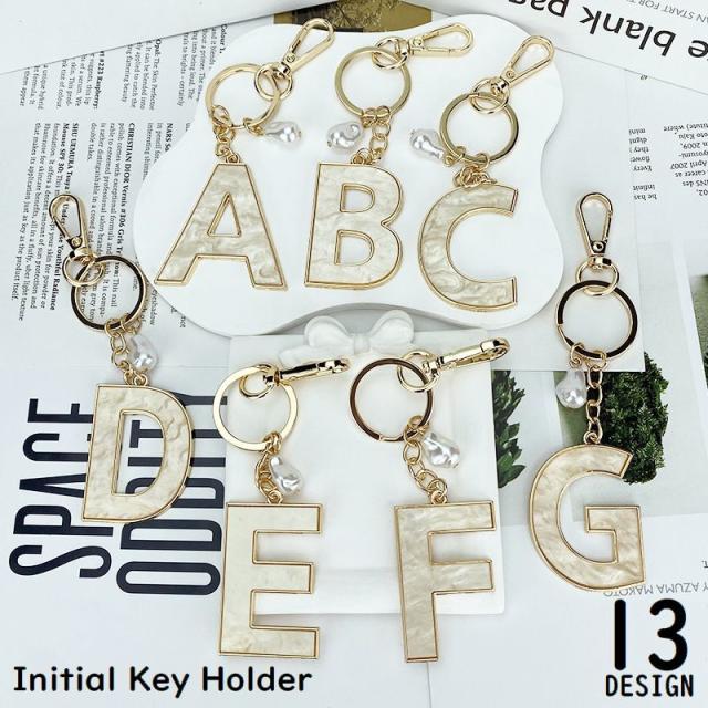 パール風チャーム&ナスカン付きのイニシャルキーホルダーです。