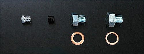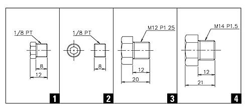 プラグボルトは、1/8PT10mm六角、1/8PT六角穴付きテーパーネジ、M12P1.25首下12mm、M14P1.5首下12mmの4タイプを用意しています。