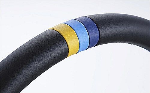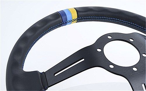 GReddyカラーのステッチ高級革のリムブラックアルマイトスリースポークはそのままに 深さを80mmで設定。