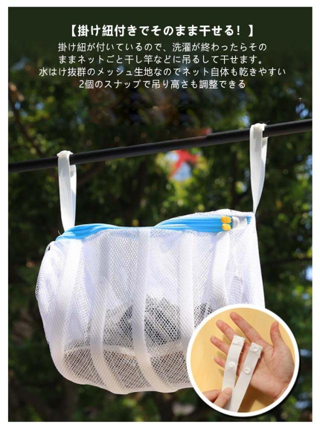 | 吊り下げ&折りたたみ可能 3つの構造で高機能の実現! 靴用円筒型洗濯ネット 【円筒型の洗濯ネットでしっかりと汚れを落とす!】 円筒型の洗濯ネットは、平たい角型に比べ立体的な構造になっているため、 ネットの中で洗濯物が動くので汚れが落ちやすいのが特徴です。 大容量で大きいサイズのシューズ(28cm程度まで)も洗えます! 【3つの構造で高機能の実現!】 構造1 7つのスポンジで衝撃、騒音を抑える ネットを囲う様に設置された5つの円環スポンジ+2つのサイドスポンジは、 洗濯中の内外からの衝撃を吸収、靴をしっかり守り騒音も軽減します。 構造2 粗いメッシュで洗浄力UP ネット外側は網目の粗いメッシュ生地。 網目の粗いメッシュ生地は、洗剤や水が十分に行き届き、汚れが落ちやすくなります。 構造3 細いメッシュでダメージ回避 ネット内側の仕切り部分は網目の細いメッシュ生地。 網目の細いメッシュ生地は、ネット内での洗濯物同士の絡み合いや摩擦を抑え、洗濯物の損傷を防ぎます。 ネットの内部はダブルポケットになっていて、靴を分けて洗濯できるのでよりダメージを軽減できます。 便利なダブルファスナーとファスナー収納カバー 【掛け紐付きでそのまま干せる!】 掛け紐が付いているので、洗濯が終わったらそのままネットごと干し竿などに吊るして干せます。 ●水はけ抜群のメッシュ生地なのでネット自体も乾きやすい ●2個のスナップで吊り高さも調整できる まだまだ、ここもすごい! 衣類にも使える 折りたたみ可 | |