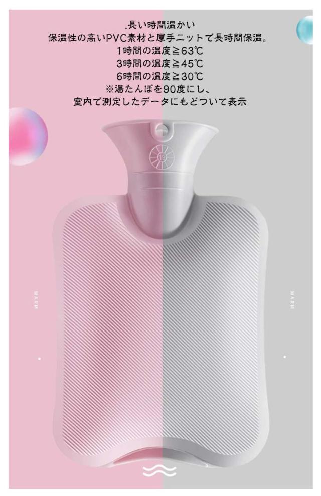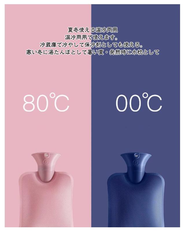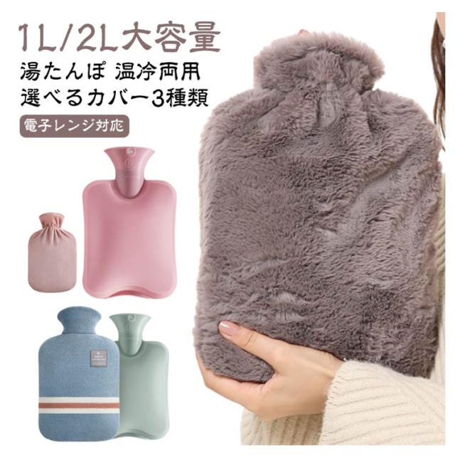 | 1L/2L大容量 選べるカバー3種類 温冷両用 電子レンジ対応 湯たんぽ 今、大人気のソフトなボトルの湯たんぽです。 手、お腹、腰、足に優しくフィット。冷えや痛みを軽減します。 時間ほどよい暖かさをキープしてくれます。 シンプルなニットカバーが付属しており、5色から選べます。 電子レンジで温めることができるため、忙しい時でも手軽に使えます。 冬の冷たいお布団に入れて、優しく温めたり、オフィスのエアコン冷え対策にも◎ 水を入れて、冷蔵庫で冷やすか、氷を入れるだけで簡単に水枕に変身。 夏の寝苦しい夜、発熱した時にも大活躍です。 容量は1L&2Lで、手や腰やお腹などを温めるのに適しています。 柔らかなカバーは心地よく、リラックスタイムにぴったりです。 プレゼントにもおすすめで、寒い季節を、この湯たんぽで快適に過ごしましょう。 01.長い時間温かい 保温性の高いPVC素材と厚手ニットで長時間保温。 1時間の温度≧63℃ 3時間の温度≧45℃ 6時間の温度≧30℃ ※湯たんぽを90度にし、室内で測定したデータにもどついて表示 02. 無毒無臭PVC ほとんどの湯たんぽとは違い、高品質の合成PVCを採用しており、お湯を追加する高温でも臭いがしません。 3D斜めストライプ、マットな質感、滑りにくく、放熱均一、長時間保温可能です。 03.厚手PVC・水漏れしない 2.3mm厚のPVC材質で、防爆が漏れない、耐劣化性。 水漏れ防止設計の気密性の高いキャップを採用。 耐久性に優れた素材で破裂や水漏れを防ぎます。 04.夏冬使える温冷両用 温冷両用で使えます。 冷蔵庫で冷やして保冷剤としても使える。 寒い冬に湯たんぽとして暑い夏・発熱時に水枕として 05.繰り返し使え経済的 電子レンジで温めて繰り返し使える お湯を入れても使えるのはもちろん、電子レンジで温めOK。 ※レンジで温める場合は必ずニットのカバーは外してから温めてください。 TIPS:水の3分の1を入れ、 レンジ出力1500wで2へ3分加熱。 06.柔らかく温かいなカバー 柔らかく取り外し可能なニットカバーが付いており、 カバーは高温の熱傷を防止し、保温時の長さ増加。 汚れている場合は、手洗いまたは交換できます。 カバーは高弾力があり、着脱しやすいです。 07.シーンにより選べる2つ容量 寒い夜のお供に お | |