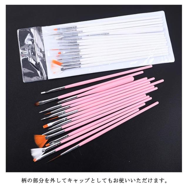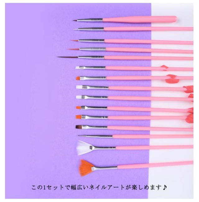 | ジェルネイル専用ブラシ15本セットです。 ファンブラシからドットペンまで15種類の毛先の違うペンがセットでお買い得!! この1セットで幅広いネイルアートが楽しめます♪ サイズや形が違うから、ハンドにもフットにも使いやすく、アートの幅が広がります。 柄の部分を外してキャップとしてもお使いいただけます。 これから始める方も、持っていたペンが駄目になってしまった方にもオススメです。 | |