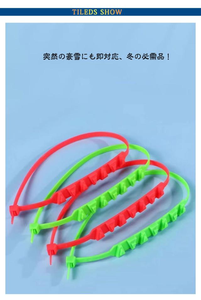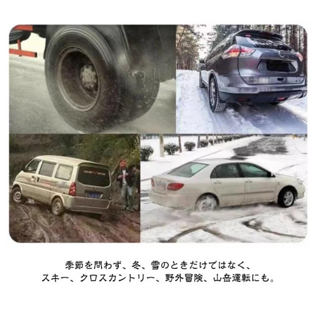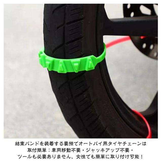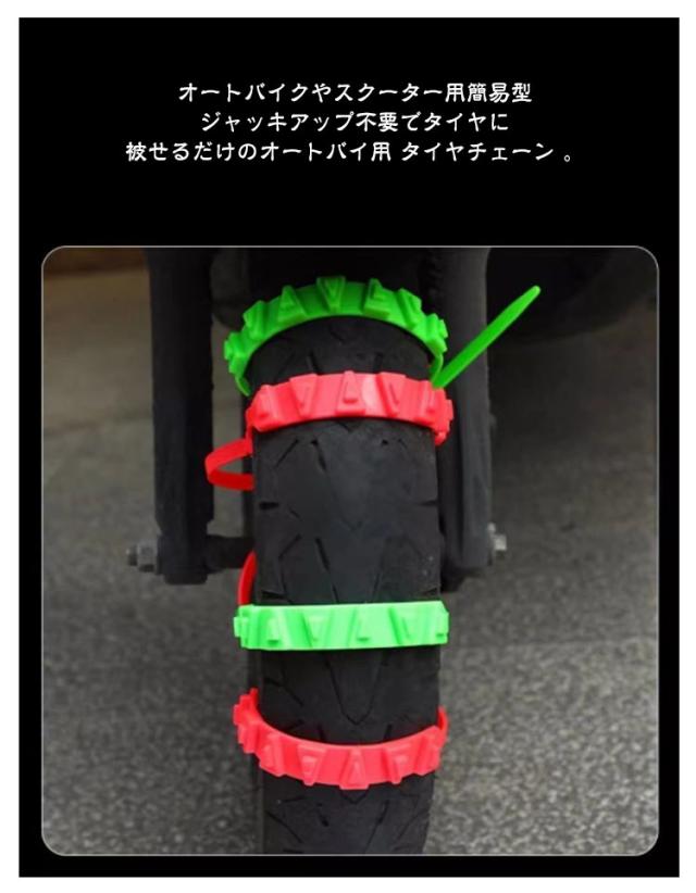 | 【20本セット】【タイヤチェーン】【雪対応】 突然の豪雪にも即対応、冬の必需品! オートバイク、スクーター用など、さまざまなにバイク適のオートバイ用 タイヤチェーン しています。 オートバイクやスクーター用簡易型ジャッキアップ不要でタイヤに被せるだけのオートバイ用 タイヤチェーン 。 結束バンドを装着する要領でオートバイ用タイヤチェーンは取付簡単:車両移動不要・ジャッキアップ不要・ツールも必要ありません、女性でも簡単に取り付け可能! タイヤチェーンは、雪の泥や砂に優れたグリップを提供します。 耐摩耗性、耐低温性、強靭性、耐久性に優れた高品質のナイロン素材を使用。 季節を問わず、冬、雪のときだけではなく、スキー、クロスカントリー、野外冒険、山岳運転にも。 | |