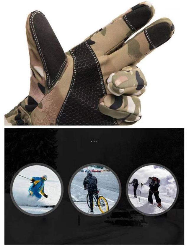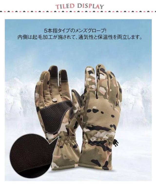 | 【防水素材】【滑り止め】【タッチパネル対応/スマートフォン対応】 5本指タイプのメンズグローブ! 内側は起毛加工が施されて、通気性と保温性を両立します。 カモフラージュ柄でとってもおしゃれです。 手首がゴム付き、冷たい風の入りを防ぎ、もっとウォーマーになリます。 | |