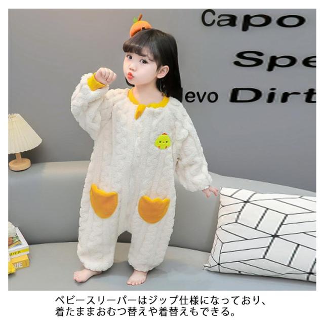 | 寝るときに布団をかけても、足で蹴飛ばしてしまう子供に大人気なスリーパー。 フランネルを採用して、毛足が長くなり、ふんわりソフトな肌触りと軽い着心地があります。 ベビースリーパーはジップ仕様になっており、着たままおむつ替えや着替えもできる。 足分けのデザインで、赤ちゃんは自由に歩き、走り、動き回ることができます。 お風呂上りの湯冷め対策や、朝のお目覚め時など、いろんなシーンで大活躍でございます。 | |