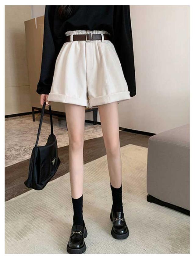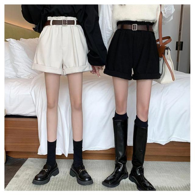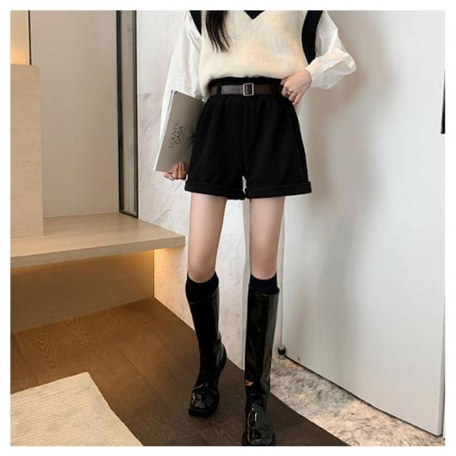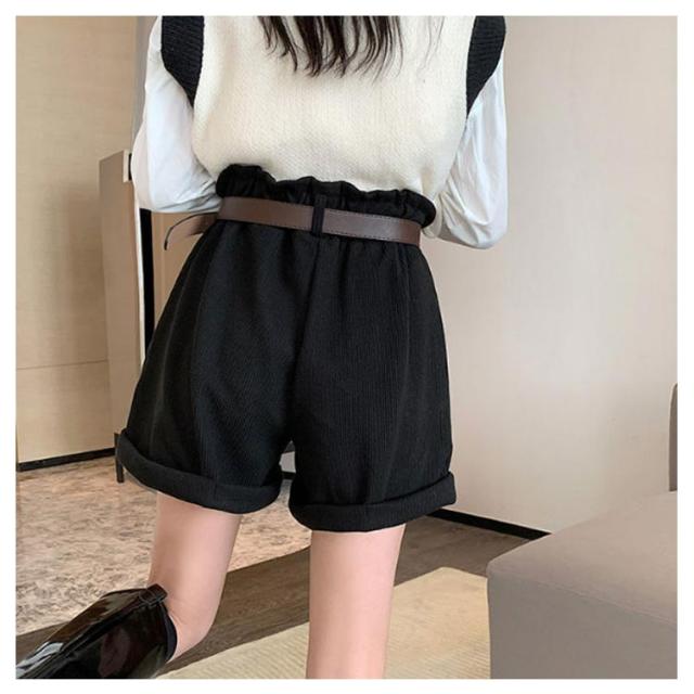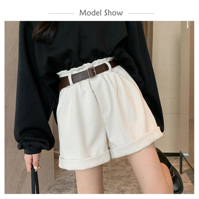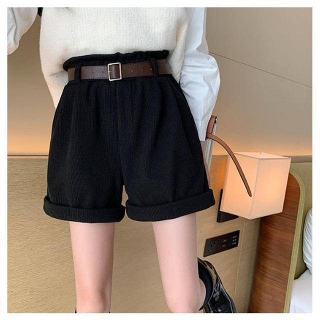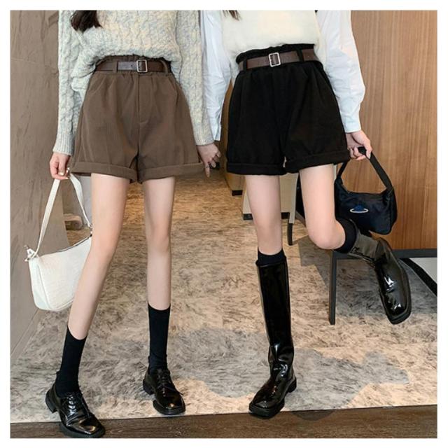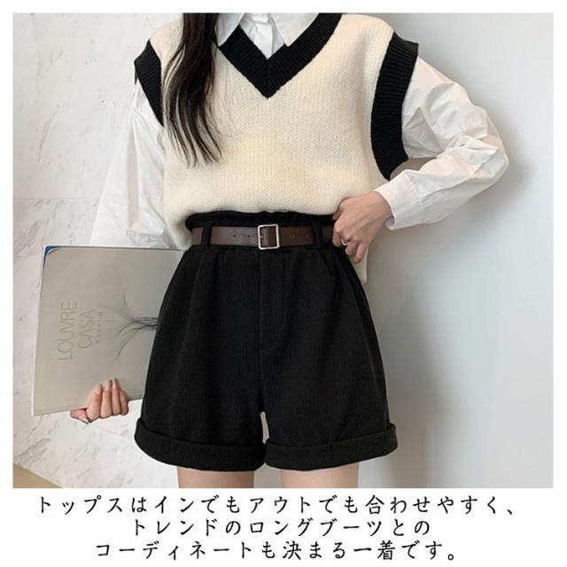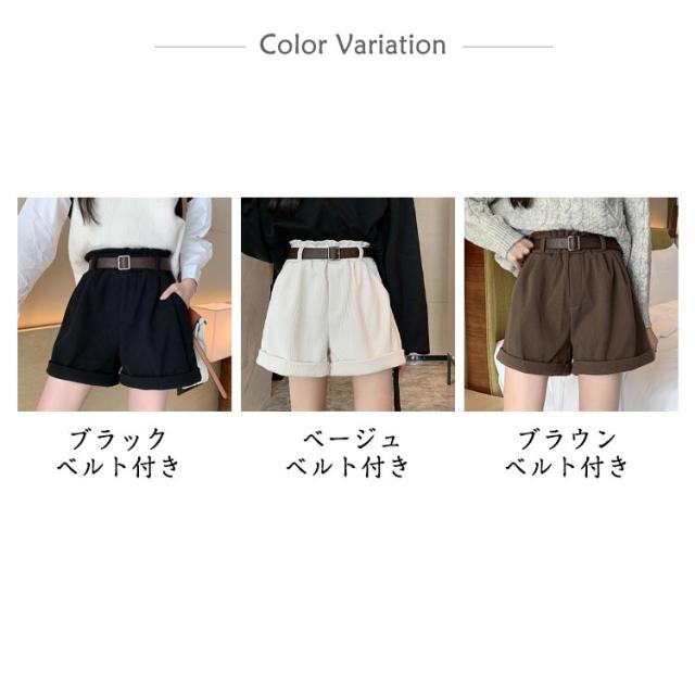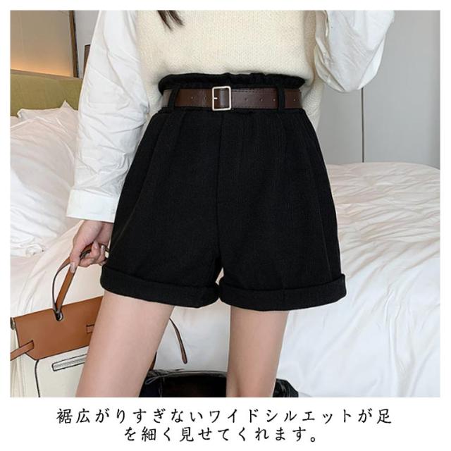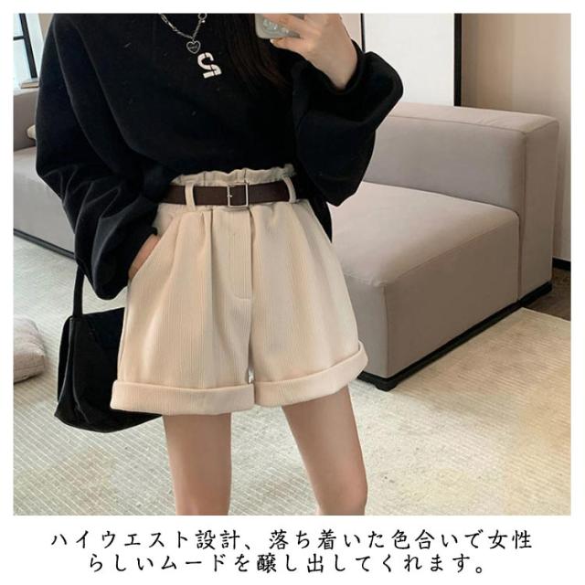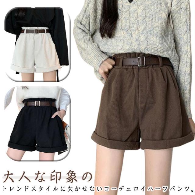 ベルト付き!秋冬 ショートパンツ 膝上丈 パンツ 送料無料 レディース ハーフパンツ 短パン ハイウエスト コーデュロイ 膝上 ボトムス Aライン ゆったり 美脚 着やせ