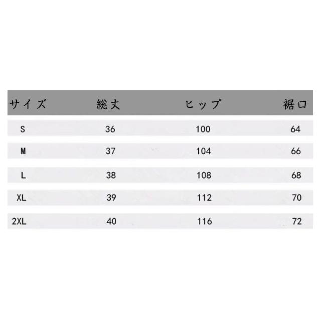 | サイズについての説明 | S総丈36 ヒップ100 裾口64 M総丈37 ヒップ104 裾口66 L総丈38 ヒップ108 裾口68 XL総丈39 ヒップ112 裾口70 2XL総丈40 ヒップ116 裾口72 |