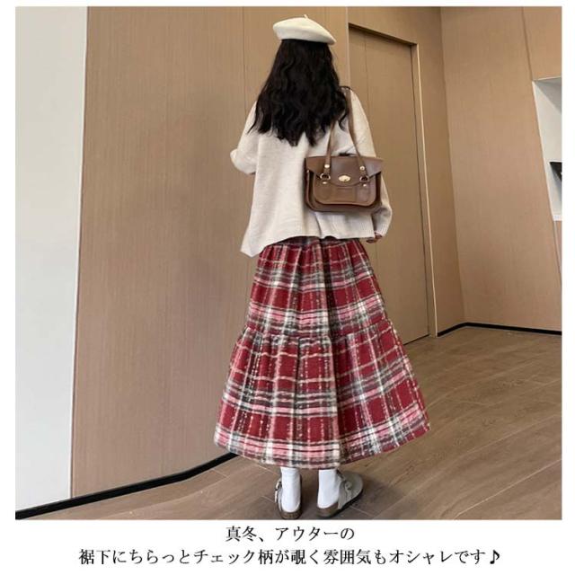チェックスカート ティアード スカート ティアード スカート チェック柄 ティアードカート ロングスカート フレア Aライン マキシスカート 長め ロンスカ 起毛素材 ウエストゴム 体型カバー きれいめ 秋 冬 レッド ブルー ネイビー ブラウン