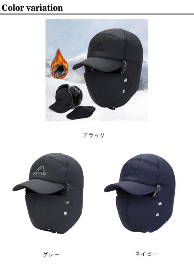 | 裏起毛で極暖あらゆる気温状況に対応!フェイスマスク取り外し可能!耳あて・マスク・裏起毛付きフライトキャップ。 裏起毛で極暖キャップまたはパイロット帽としてご使用いただけます。 顔を温めるものを取り外す可能! また、耳当てを頭の上にまとめることができて、つがあれば便利!落ち着いた配色とながらも飽きの来ない デザインで様々な髪色や服に合わせやすいです。 防寒機能&お洒落!耳当てをつけて、頭や耳をふんわり包んで自転車に乗っても風に飛ばされません。寒いこの季節に、暖かいトラッパーハットは防寒機能だけでなくファッションの一部として頭を寒さから守ります。 あらゆる用途に!シンプルで使いやすいデザインなので、プレゼントにもおススメです。スノーボードやスキー、登山、ゴルフ、 サイクリング、釣りなど様々なアウトドア スポーツはもちろんのこと、ジョギングや ガーデニング、普段のちょっとしたお出かけ にも役立ちます。自転車での通勤・通学、雪かきなどの冬場の屋外作業、ツーリング、 サバゲー、スポーツ観戦などでも活躍。 | |
