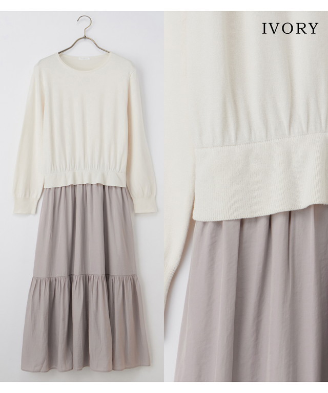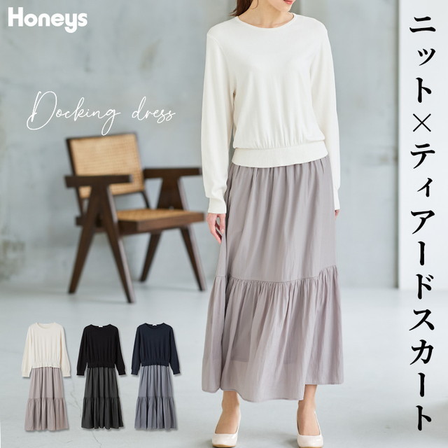 ワンピース 長袖 ロング丈 ミモレ丈ワンピース ニットワンピース ティアード ドッキング クルーネック レディース SALE セール Honeys ハニーズ ドッキングワンピース