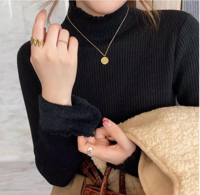 リブニット ニットトップス インナー ニットソー ハイネック 長袖 裏起毛 フリルネック 無地 秋 冬 あったか 暖か ブラック
