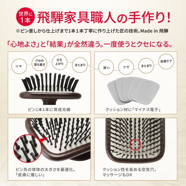 復元ブラシPETを制作するのは、高級木製家具で有名な"飛騨”の木工職人。古くは日本書記にも「飛騨の匠」として登場するほど 長く培われ受け継がれた「技」が、一本一本に活きています。使い込むほどに、被毛もブラシも輝くツヤに。自然が育んだ個性豊かな木目、心地よく手に馴染む曲線、このため息が出るようなコラボレーションを支える飛騨の匠の技。天然木、手作業だからこそ生まれるそれぞれの個体差・個性も逸品の証です。