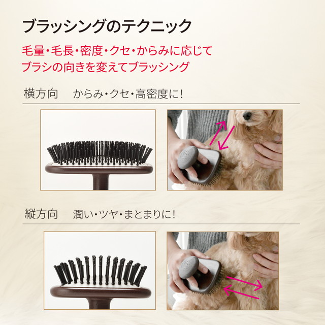 ●毛量・毛長・密度・クセ・からみに応じてブラシの向きを変えてブラッシング