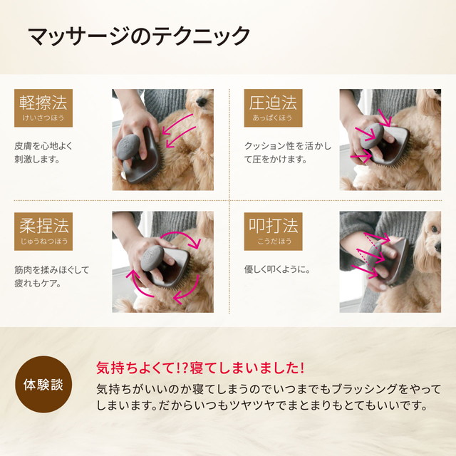 ピンの先は球体にしているので皮膚にもやさしい仕様になっています。被毛をとけばとくほどツヤが出てやわらかく仕上がります。またマッサージブラシと言われているこのブラシはクッション性が高く、たたく、もむなど優しくマッサージができる設計です。