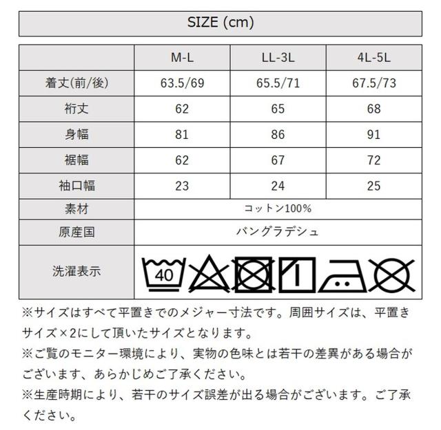 | [M-Lサイズ]着丈(前/後):63.5/69cm、裄丈:62cm、身幅:81cm、裾幅:62cm、袖口幅:23cm [LL-3Lサイズ]着丈(前/後):65.5/71cm、裄丈:65cm、身幅:86cm、裾幅:67cm、袖口幅:24cm [4L-5Lサイズ]着丈(前/後):67.5/73cm、裄丈:68cm、身幅:91cm、裾幅:72cm、袖口幅:25cm ※平置き実寸サイズとなります為、若干の誤差が生じる場合がございます。 |