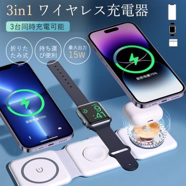 3in1 ワイヤレス充電器 置くだけ充電 magsafe対応 急速充電 15W 折り畳み式 applewatch iphone airpods同時充電