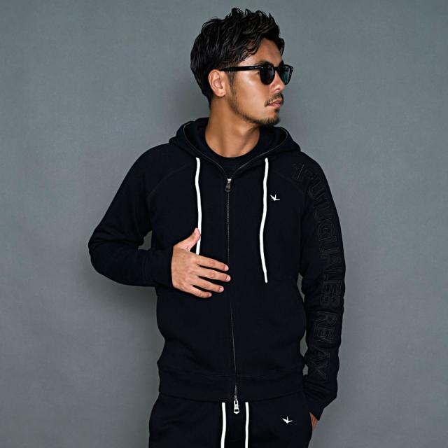 肩から袖口まで大胆にブランドロゴを配置したジップフーディー。