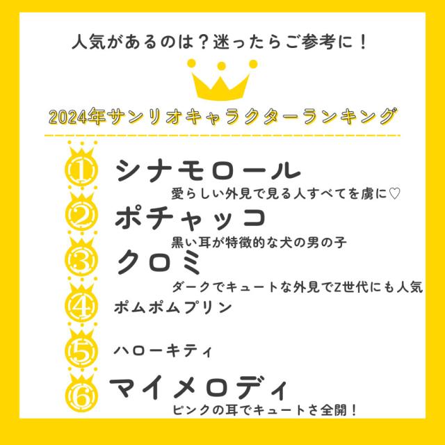 | 色の種類 | 4色(マイメロディ・ポチャッコ・シナモロール・クロミ) |