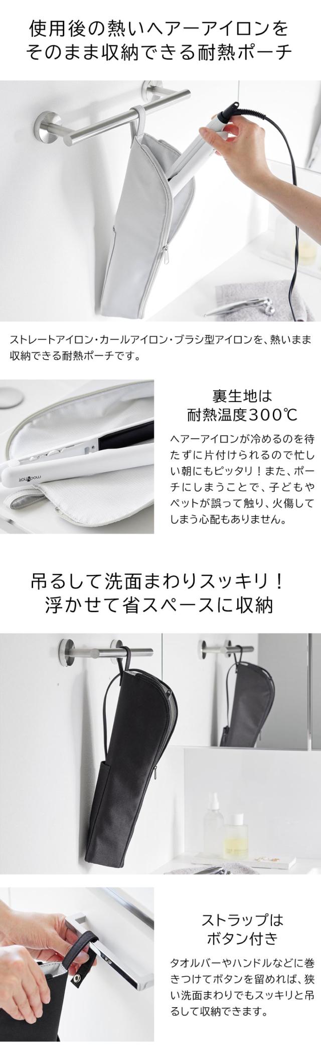 ヘアーアイロンを熱いまま収納できる!吊り下げても置いても出し入れ簡単な耐熱ヘアーアイロンポーチ。吊るして浮かせることで洗面所もスッキリ。ストラップはボタン開閉式なのでタオルバーなどにも吊り下げられます。収納したヘアーアイロンはカバーで覆われているので子供やペットにも安心です。裏生地は耐熱温度300℃なので使用中のヘアーアイロンを熱いまま置いても安心。ファスナー付きポケットには電源コードが収納でき、出し入れもスムーズです。ポーチのファスナーは上まで閉まるので、持ち運びの際もヘアーアイロンの飛び出しを防止できます。