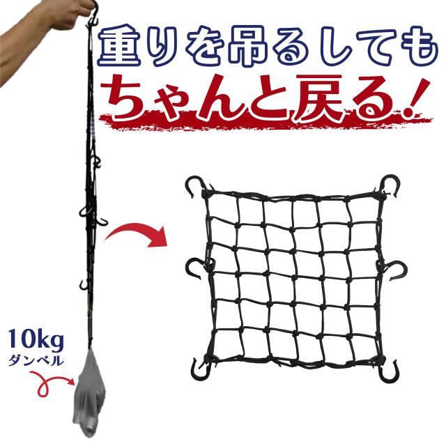 強力なゴムを使用したネットは、かばんや箱、ヘルメットなどもまとめて載せる事が可能です。