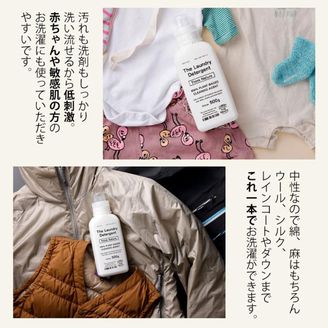 THE 洗濯洗剤 Think Nature 500g ボトル 衣類用洗剤 中性 部屋干し 液体 エコ 柔軟剤不要 やさしい 敏感肌 おしゃれ着 赤ちゃん用 節水 節電 洗たく洗剤 ウール シルク ダウン 500ml がんこ本舗