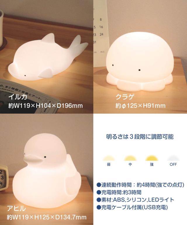 ライト ナイトライト 夜間照明 照明 ランプ ルームランプ ナイトルーティーン 癒し リラックス おむつ替え 授乳 卓上 デスクライト ベットサイド 寝室 廊下 トイレ 出産祝い 誕生日 誕生日プレゼント クリスマス クリスマスプレゼント USB LED シリコン 子供 目にやさしい 三段階 暖色 贈り物 お祝い 動物 水生動物 海洋生物 海 水族館 鳥 とり トリ コールダッグ 海月