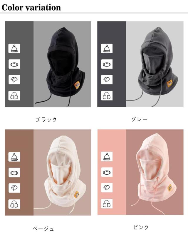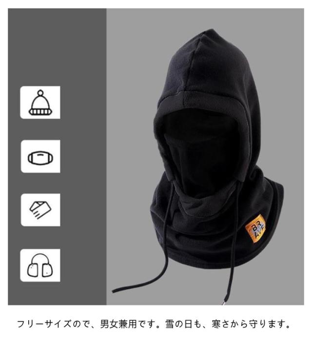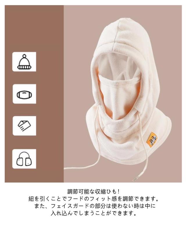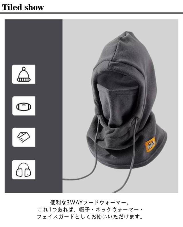 | 防寒できるフード付き、肌にやさしい厚型フリース素材を採用し、ふわふわで保温性抜群のフードウォーマーです。 便利な3WAYフードウォーマー。これ1つあれば、帽子・ネックウォーマー・フェイスガードとしてお使いいただけます。天候、風、気温の変化などに応じて、適切な着用方法を選択して、最高の防寒効果を得ることができます。 調節可能な収縮ひも!紐を引くことでフードのフィット感を調節できます。また、フェイスガードの部分は使わない時は中に入れ込んでしまうことができます。 自転車やバイクの 通勤・通学の防寒対策やもちろんアウトドア・スキーやスノーボートなどのウィンタースポーツの際にも活躍します。 フリーサイズので、男女兼用です。雪の日も、寒さから守ります。 | |