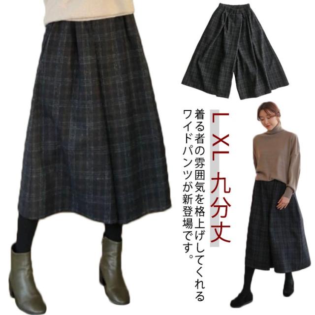 ゆったり ワイドパンツ 長ズボン 大きいサイズ ワイドパンツ ロングパンツ ハイウェスト 体型カバー ボトムス ウエストゴム チェック柄 九分丈 美脚 カジュアル レディース 通勤 秋冬 お洒落 デート 二次会