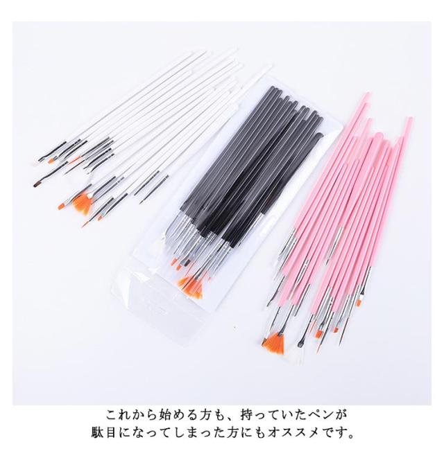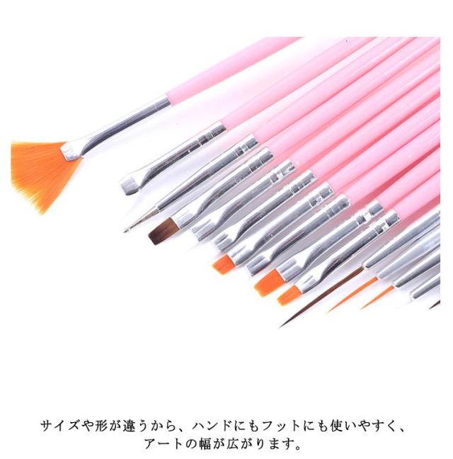 | ジェルネイル専用ブラシ15本セットです。 ファンブラシからドットペンまで15種類の毛先の違うペンがセットでお買い得!! この1セットで幅広いネイルアートが楽しめます♪ サイズや形が違うから、ハンドにもフットにも使いやすく、アートの幅が広がります。 柄の部分を外してキャップとしてもお使いいただけます。 これから始める方も、持っていたペンが駄目になってしまった方にもオススメです。 | |