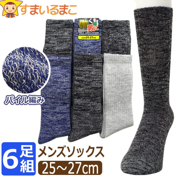 靴下 メンズ パイルソックス 杢調 綿混 クルー丈 ソックス 6足 セット 25〜27cm 色おまかせ set1416 メール便は送料無料♪ 紳士 男性 くつした くつ下 6足組 厚地 シンプル 無地 メンズソックス ビジネスソックス 足 父の日 敬老の日 まとめ買い