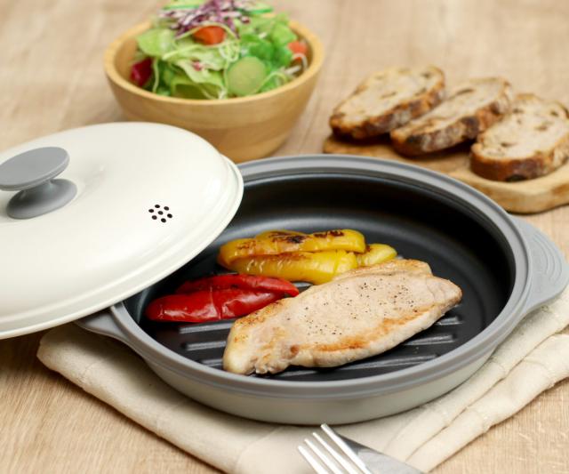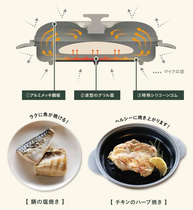 レンジを使って簡単調理ができるレンジパンです。特殊なシリコーンゴムがマイクロ波を熱に変えグリル面に熱を伝えることで、焼き目をしっかり付けることができます。