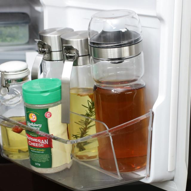 冷蔵庫のドアポケットにすっきり収まり、片手でサッと出し入れしやすいコンパクト設計です。