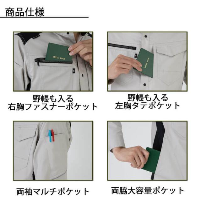 ・豊富な胸ポケット:野帳が入る縦ポケットや、大容量のファスナーポケット、ペン差し付きフラップポケットなど使いやすいポケット仕様。