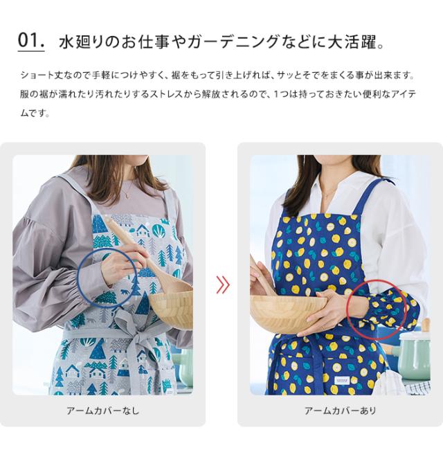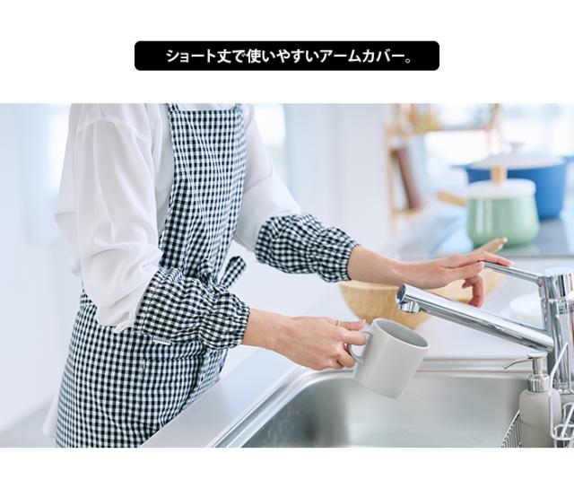 水廻りのお仕事やガーデニングなどに大活躍するアームカバー。ショート丈なので手軽につけやすく、裾をもって引き上げれば、サッとそでをまくる事が出来ます。裾にループを取りつけているので、使っていないときはフックなどに吊り下げることが出来ます。また、使用後に吊るして乾かすことも。服の裾が濡れたり汚れたりするストレスから解放されるので、1つは持っておきたい便利なアイテムです。