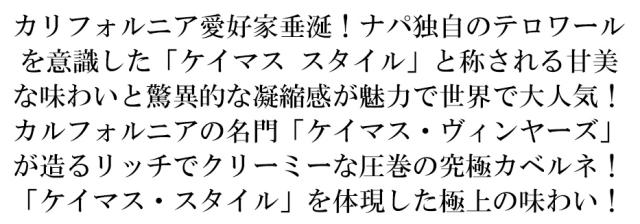 カリフォルニア愛好家垂涎!ナパ独自のテロワール を意識した「ケイマス スタイル」と称される甘美 な味わいと驚異的な凝縮感が魅力で世界で大人気! カルフォルニアの名門「ケイマス・ヴィンヤーズ」 が造るリッチでクリーミーな圧巻の究極カベルネ! 「ケイマス・スタイル」を体現した極上の味わい!
