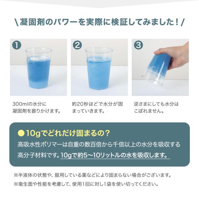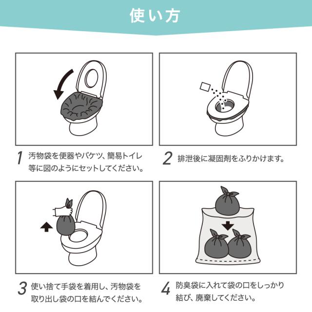 ● 本製品は小便及び大便に使用できますが、凝固剤は水分を吸収して固めるものであり、固形物を固めることはできません。 ● 汚物の量や状態によって、臭いや汚水漏れを完全に抑制できない場合もございます。 ● お子さまの誤飲などの事故を防ぐため、 本製品を幼児や子どもの手の届かない場所で保管してください。 ● 汚物袋は幼児や子どもの手の届かない場所に保管してください。 ● 汚物袋を破らないようご注意ください。 ● 汚物袋を尖ったものに接触させないでください。 ● 凝固剤を直接便器で使用しないでください。 詰まりなどの故障の原因となります。 ● 極端に大量の便の場合、 完全に凝固しない場合があります。 ● 排泄物の上にトイレットペーパーなどを乗せていると凝固剤がかからなくなるのでご注意ください。 ● 使用後は汚物袋の口をしっかりと結んでください。 ● 廃棄についてはお住まいの地域の処理方法に従ってください。 ● ポリエチレン素材を使用している関係で、開封時に臭いがする場合がございます。 ● 直射日光が当たる場所、湿気が多い場所での保管はしないでください。 ● 凝固剤が目に入った場合は、清潔な水で5分以上洗い流してください。 水がない場合は大量の常温のお茶などで洗浄し、医師に相談してください。 ● 本製品は食用凝固剤ではありませんので、絶対に口に入れないでください。万が一飲み込んだ場合、すぐに水で口の中を洗浄し、コップ1〜2杯の水か牛乳を飲み、医師に相談してください。 |
