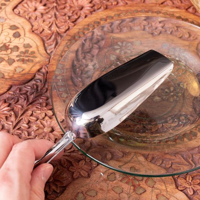 インドからやってきたサービングスプーンです。インド版しゃもじとして、主にご飯物を取り分けるときなどに使われています。インド定番のステンレス製で丈夫な作り。見た目はスタイリッシュでおしゃれなフォルムです。インド料理を食べるときの、ライスやビリヤニの取り分けに活躍しそうです。もちろんインド料理以外にも、パエリアなどさまざまなお料理の取り分けにご使用いただけます。