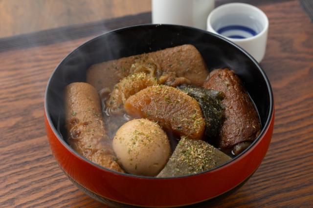 原材料(アレルギー表記含む):【おでん具】大根(国産)、たまご、ごぼう巻、黒はんぺん、焼ちくわ、こんにゃく、牛すじ、結び糸こんにゃく、昆布/水酸化Ca(こんにゃく用凝固剤)